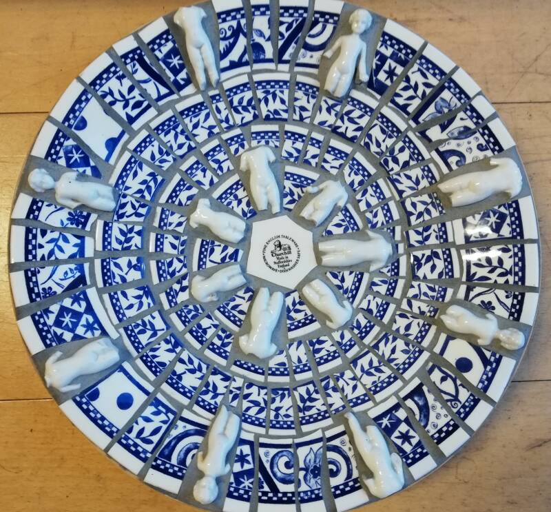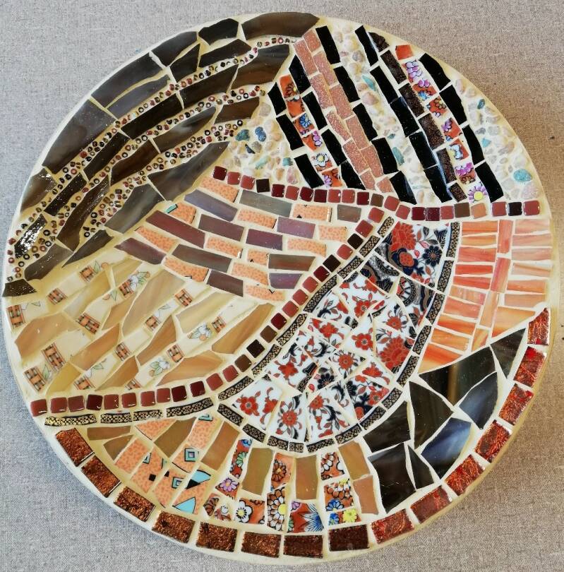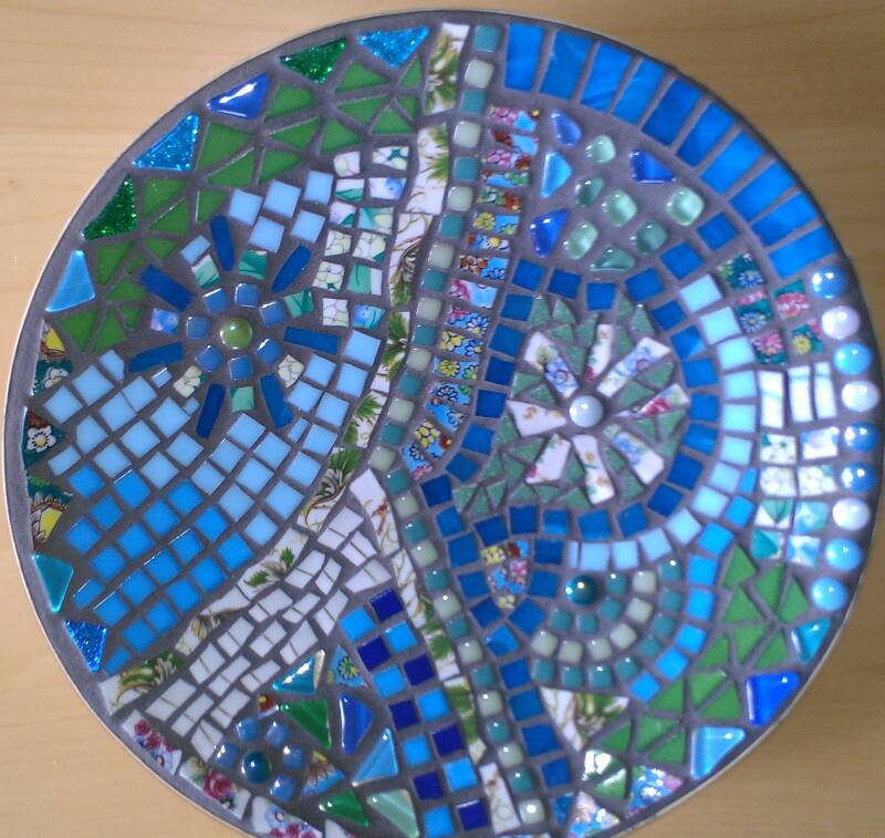 Herinneringsschaal. Gemaakt met mozaïek van servies van mijn moeder. Het grappige is dat er, en dat is onbewust gebeurd, een 'R' te zien is. De R van Riekje, mijn moeder. De R van Rensink mijn achternaam.